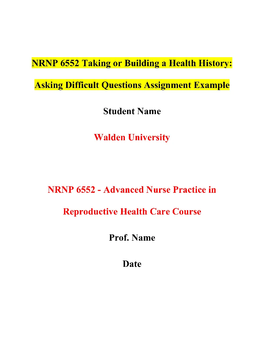 Assignment Title: NRNP 6552 Taking or Building a Health History: Asking Difficult Questions Assignment